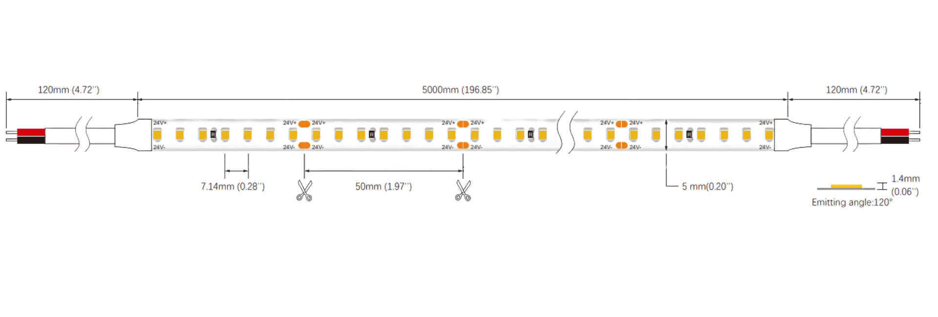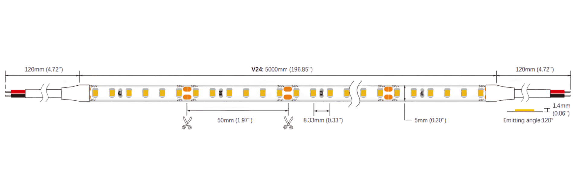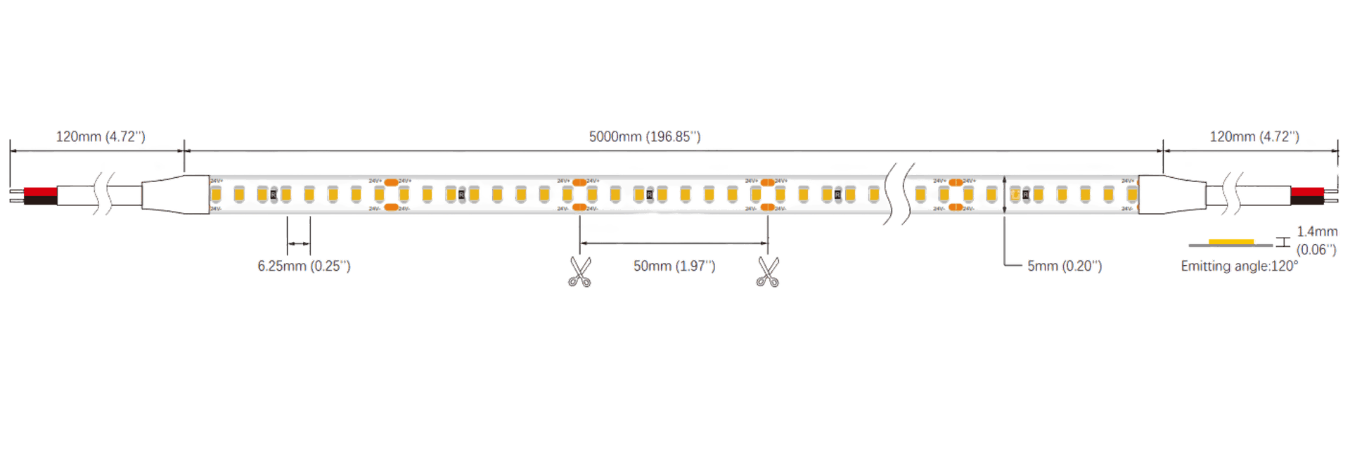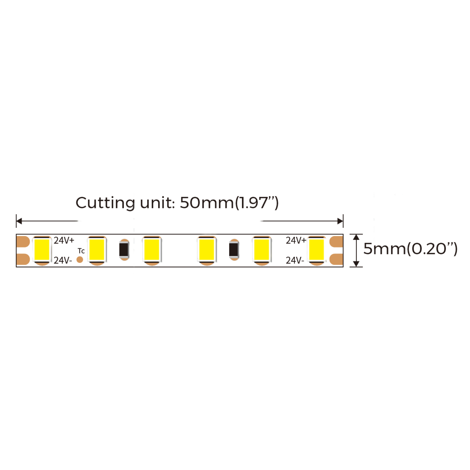 Compatible LED strip: Equipped with 24V SMD2835 LED strip (120 LEDs/m, 4.4W/ft, model SMD120SC5BL) 5mm width. Also compatible with any LED strip ≥120 LEDs/m for uniform, dot-free illumination.